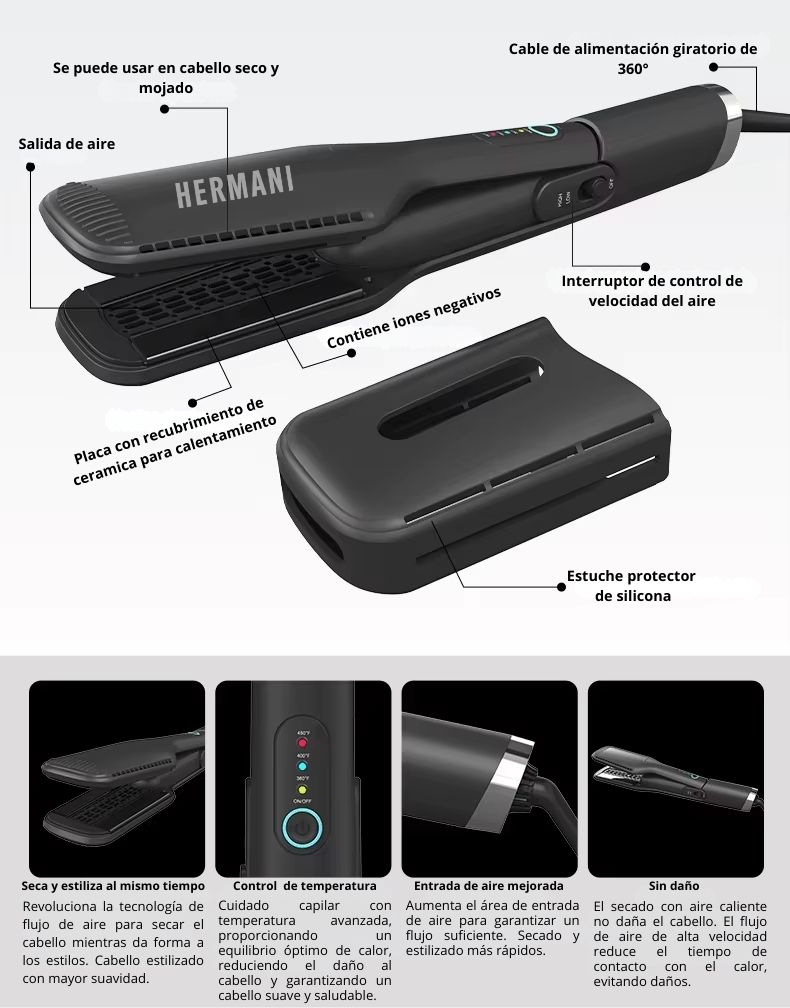 La Hermani Duo cuenta con salida de aire integrada, que permite secar el cabello mientras se alisa: